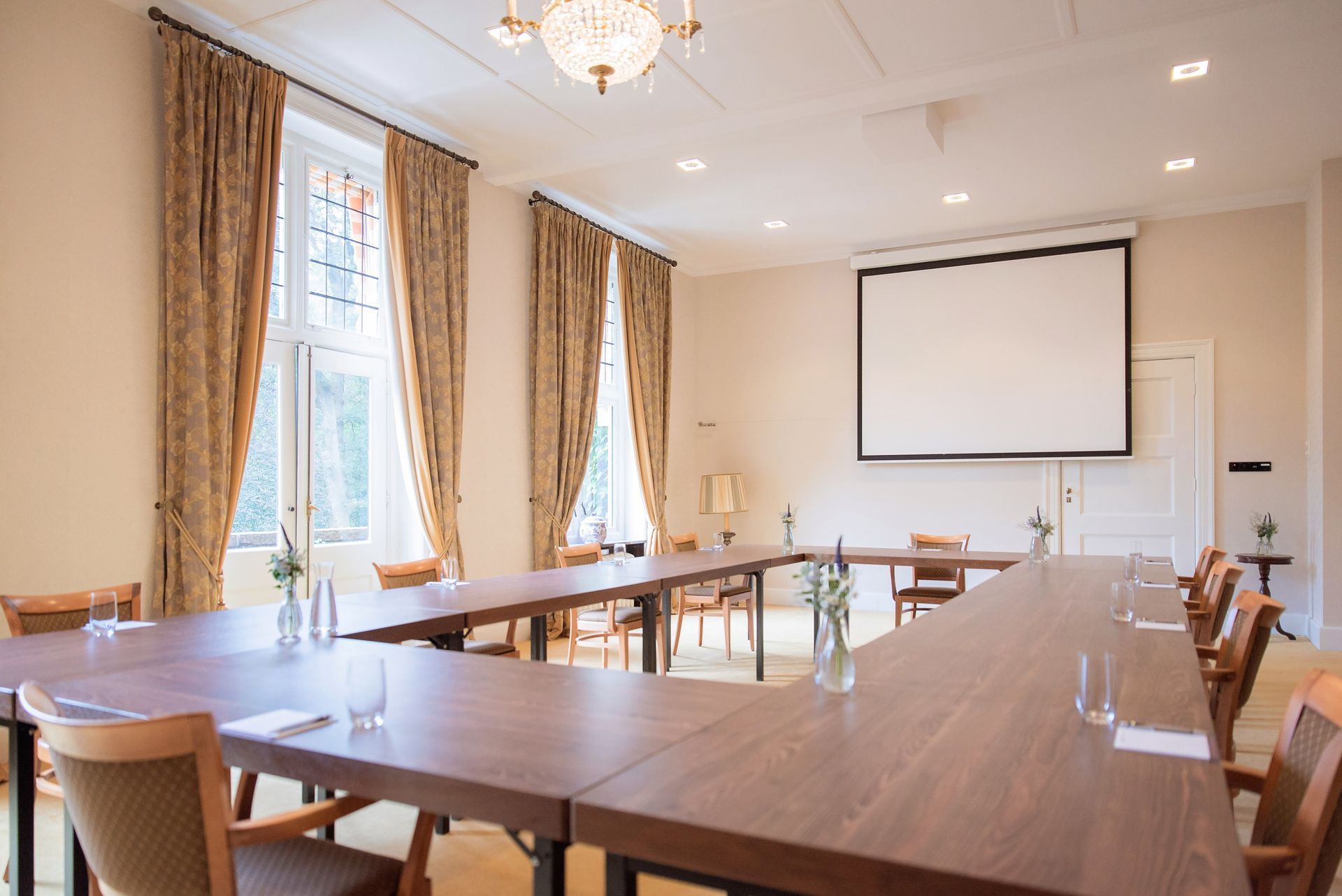 De Zitkamer bevindt zich op de eerste etage van het monumentale landhuis en is een lichte, ruime vergaderruimte met karakter. Wat deze zaal bijzonder maakt? Het prachtige bordes met openslaande deuren, waar je tijdens een pauze geniet van het uitzicht op het groene landgoed. De warme sfeer, het natuurlijke licht en de historische details maken deze ruimte ideaal voor bijeenkomsten waarbij rust, focus en comfort centraal staan. Je zit hier goed voor een heisessie, strategisch overleg of een creatieve werksessie met een middelgrote groep. Vergaderen in de Zitkamer betekent dat je even helemaal weg bent van de dagelijkse hectiek. Wij zorgen dat het je aan niets ontbreekt en bieden altijd een offerte op maat.